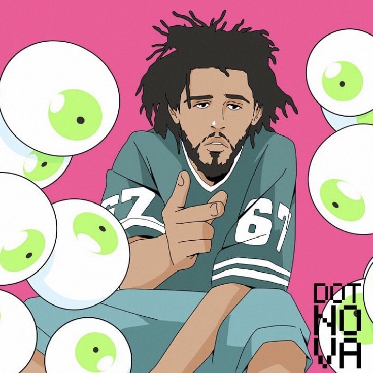 Et ce qui est également intéressant, c’est que Dotnova n’oublie pas les têtes émergentes du rap américain, puisqu’il utilise son art pour, au contraire, les mettre en valeur. Ainsi, des talents comme J.I.D, récemment aperçu aux côtés de J Cole, sont eux aussi passés sous la plume de l’artiste. Certains même vont jusqu’à lui commander des portraits, tant l’initiative est stylée.