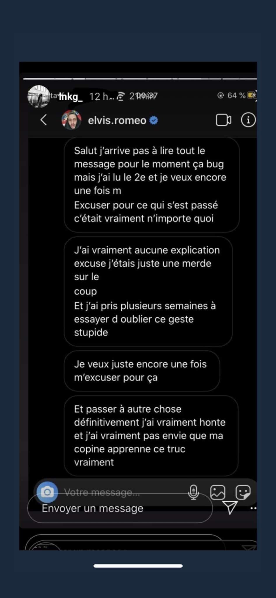 «Je voulais justement te dire que tu étais libre de faire ce que tu voulais à propos de tout ce qui s’était passé, aurait raconté Roméo Elvis. J’ai décidé de tout dire à Léna (ndlr. Simonne, sa compagne) et de te laisser le choix d’en parler en public. Je comprends que ce qui se passe en ce moment te pousse à le faire. J’aurai été vers toi et je me suis excusé mais cela ne suffit probablement pas j’en suis conscient. Je ne sais pas quoi te dire à part que j’ai vraiment honte et que ce n’est pas moi, ça ne me ressemble pas.»